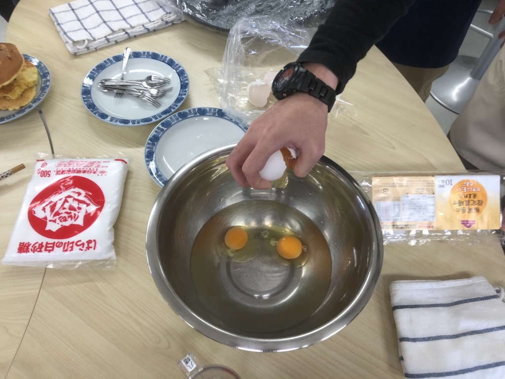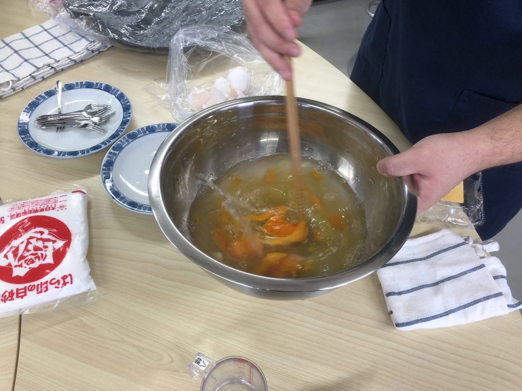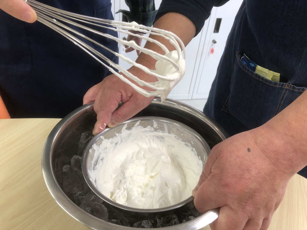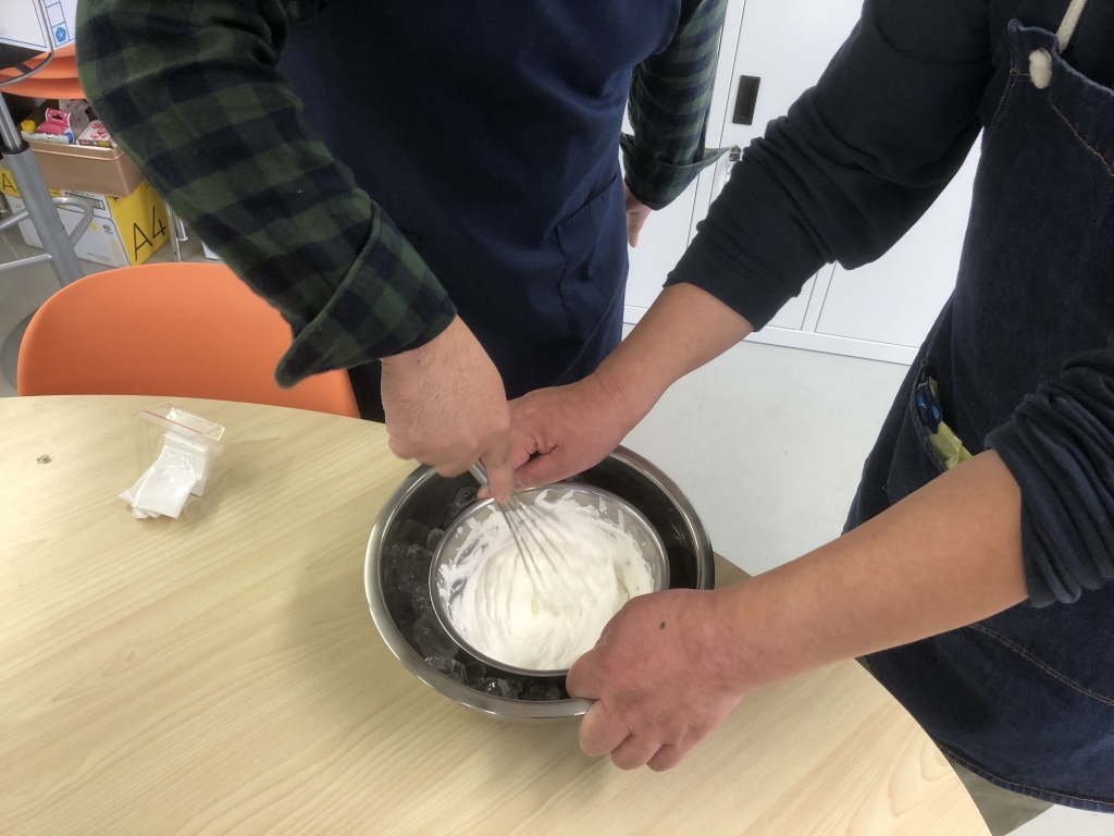 今回は、ハンドミキサーを用いず、ひたすら手作業で生地を混ぜたり、ホイップクリームを作ってもらったり。