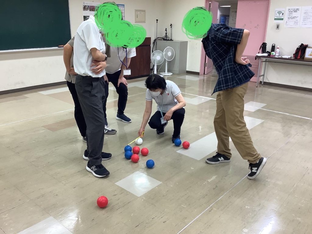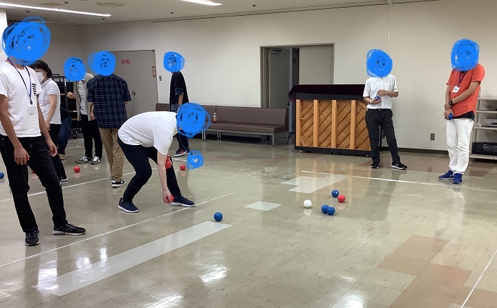 ボッチャは最初に白いボール(ジャック)を投げ入れて、そこになるべく近づくようにAチームとBチームが交互にボールを投げ入れていきます。ルールは単純ですが、実際にやってみると、相手チームのボールを弾いて遠ざけたり、自分のボールを置きたい場所に投げ入れることが難しく、コツをつかむのに時間がかかりました。