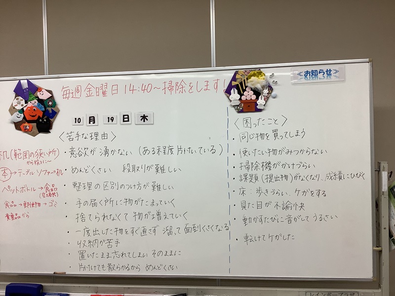 10月19日午後に整理整頓についてのグループワークをしました。パワーポイントを使ってスライドを作ってと頼まれたので作りました。イラストをいっぱい入れて分かりやすくしようと頑張って作りました。私も参加したのですが、参加している時は間違いや分かりにくい所がないか少しひやひやしました、無事に終わってよかったです。みんなの片づけについての考えなど発表したり、書き込んだりしていました。