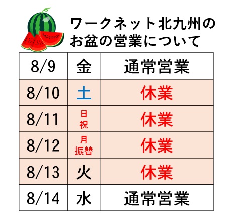 夏季休業について 2024年7月29日 最終更新日時 : 2024年7月29日 motoshige誠にご勝手ながら、ワークネット北九州は下記の期間を夏季休業とさせていただきます。2024年8月10日(土) ~ 8月13日(月)なお8月14日(火)から通常営業いたします。