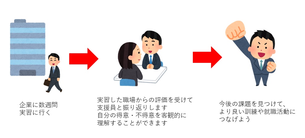 そういった変化を体験しつつ、自分の得意なことや不得意なことを客観的に評価してもらったりできます。上手く実習をこなすことができれば自信につながりますし、そうでなかった場合でもしっかり振り返りを行うことで自分の課題を見つけて今後の訓練に生かすことができます。