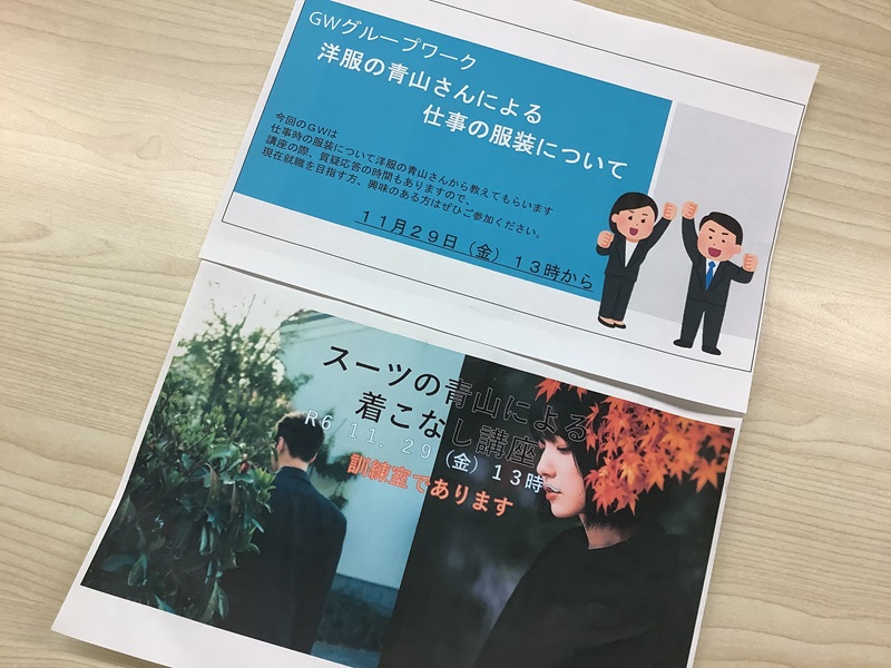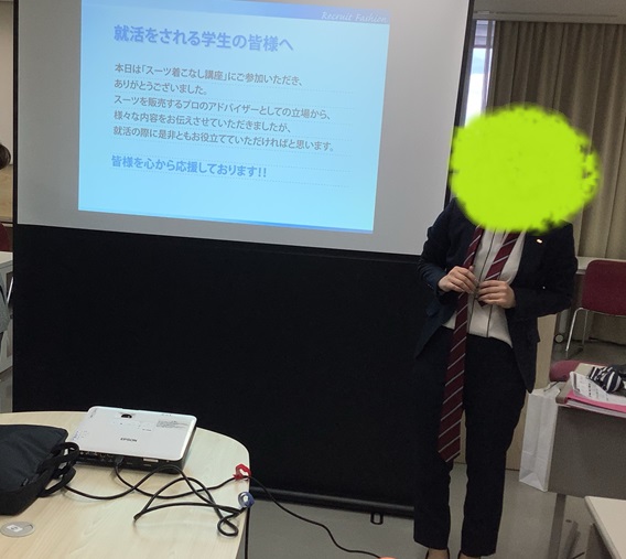 今回のグループワークでは、洋服の青山さんにお越しいただき、スーツの着こなし方とスーツを身に着けた際の所作や、面接におけるマナーなどの講義をして頂きました。