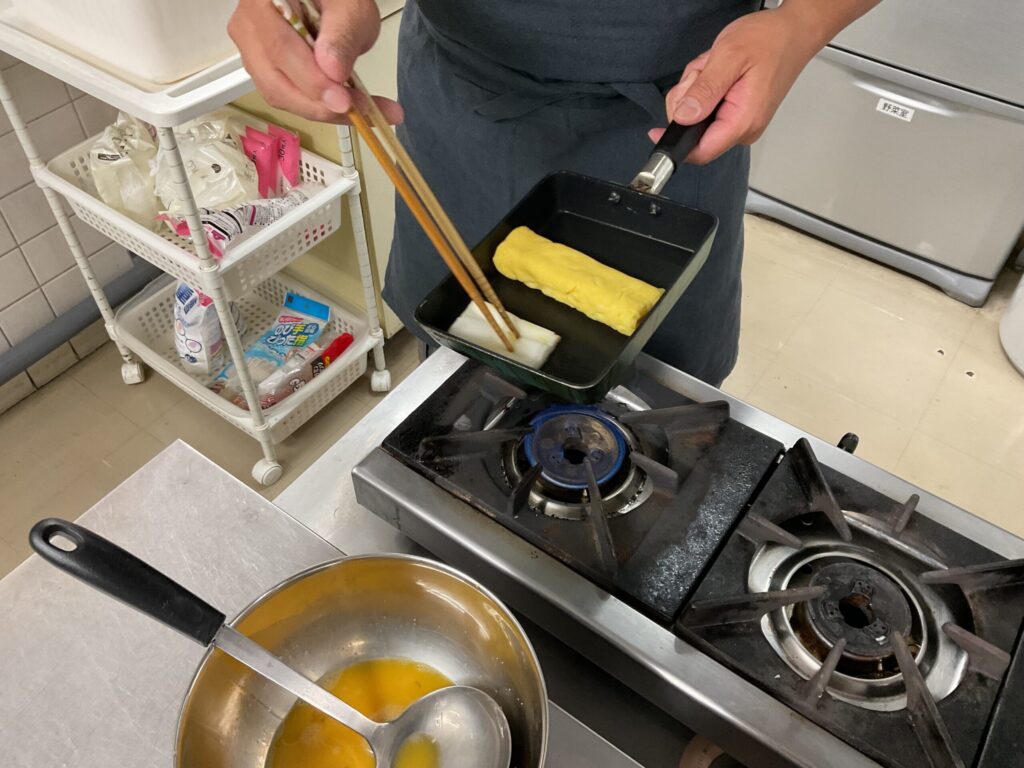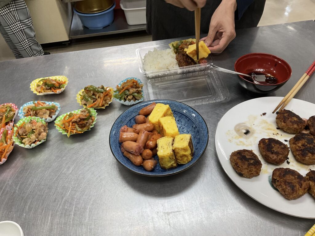 お弁当のおかずは、野菜炒め・ハンバーグ・卵焼き・ウインナーとボリュームのある内容でした。各グループ協力しておかず作りを行い、完成したおかずを、各自お弁当パックに詰めてもらいました。当日は天気も良かったので近くの公園へ行き、お弁当を食べました。
