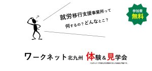 下記の通り、ワークネット北九州でどんなことができるか体験できる見学会を開催いたします。また参加者の個性や特性を知る手掛かりになるワークなども実施予定。みなさま、お誘い合わせの上、是非お越しくださいますようお願い申し上げま […]