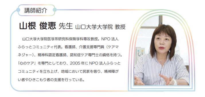 ひきこもり理解の市民講座や支援者教育に深く関わり、実践・活躍されている山口大学大学院の山根教授をお招きし、ひきこもりで悩まれている当事者・家族への支援はどうあるべきか、どのような取り組みができるかを一緒に考えます。